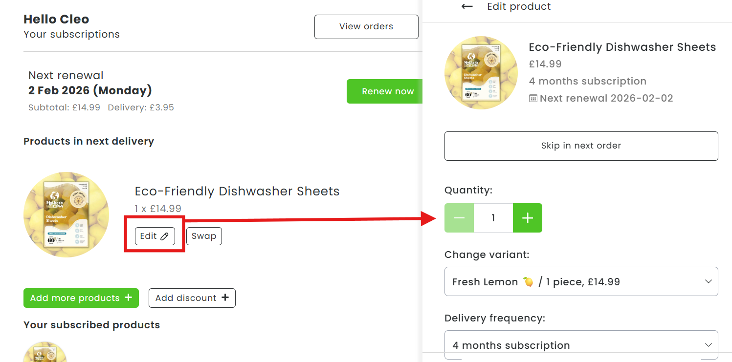 How can I change the amount of products in my subscription?Updated a month agoYour subscription is flexible. Feel free to go to your online account via this link: 👉 Login.Click on 'edit' and adapt the quantity to your liking. Was this article helpful? YesNo