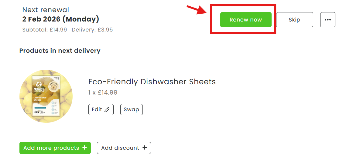 How can I renew my order immediately?Updated a month agoYour subscription is flexible. Feel free to go to your online account via this link: 👉 Login.Click on 'renew now' and confirm. Was this article helpful? YesNo